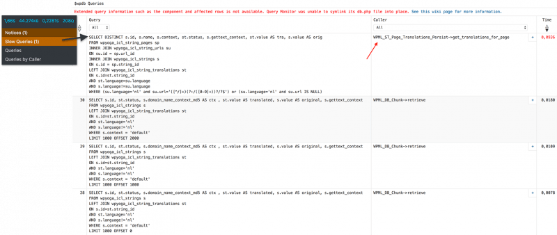 Al momento sto lavorando su un sito che utilizza WooCommerce e WPML insieme. Prima di attivare WP Rocket, ho eseguito una diagnostica con Query Monitor e ho rilevato alcune query lente: