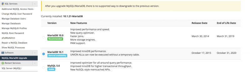 E per il database: WHM → Software → Aggiornamento MySQL / MariaDB.