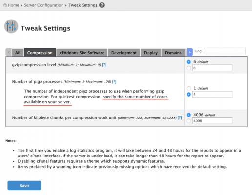 Successivamente, nel tuo WHM, aumenta il numero di processi «pigz» in base al numero di CPU del tuo server. Molte persone non ci pensano e non lo fanno mai. 😉