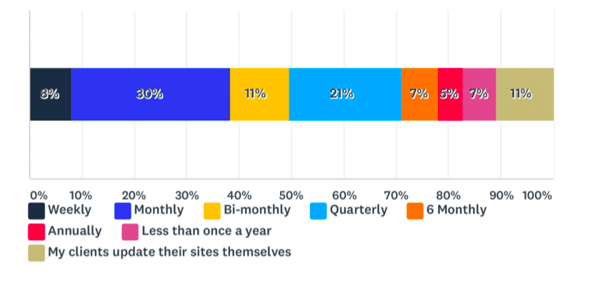 Alla domanda su quanto spesso devono aggiornare i siti Web dei loro clienti, i numeri variano di nuovo in modo selvaggio. Tuttavia, più di sette web designer su 10 affermano che è almeno trimestrale, con la risposta più comunemente citata (30%) che afferma che in genere aggiornano i siti Web dei clienti su base mensile.