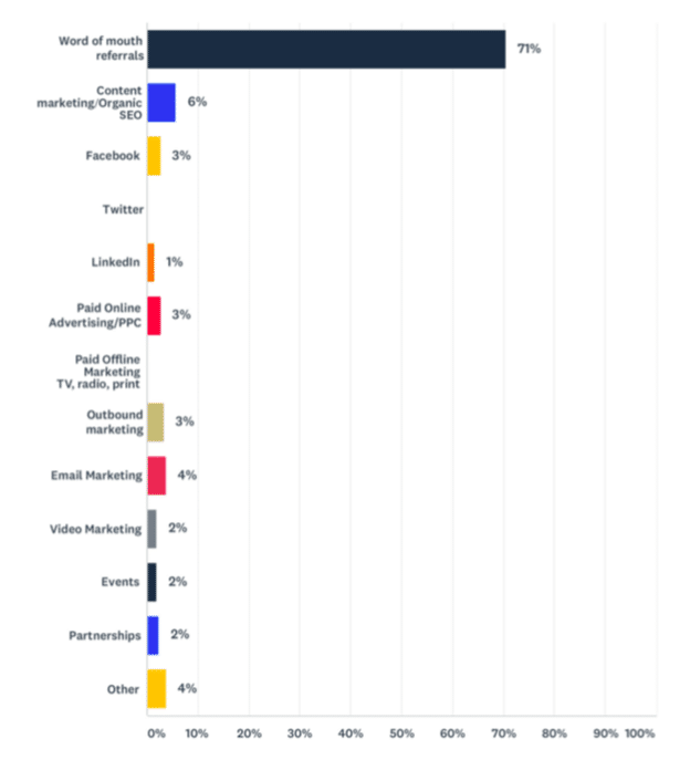Qui è il marketing passaparola, citato dal 71% degli intervistati lo pone come il loro canale numero uno per trovare nuovi clienti.