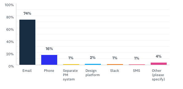 Quando abbiamo chiesto ai web designer di selezionare semplicemente il principale canale di comunicazione utilizzato, circa tre quarti hanno scelto l’e-mail, seguita dal 16% che ha selezionato il telefono.