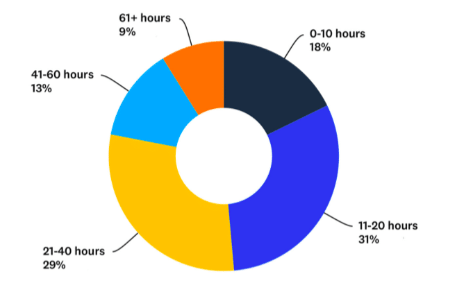 Tuttavia, la maggioranza (60%) degli intervistati si è stabilita intorno alla fascia media, tra 11-20 (31%) e 21-40 ore (29%).