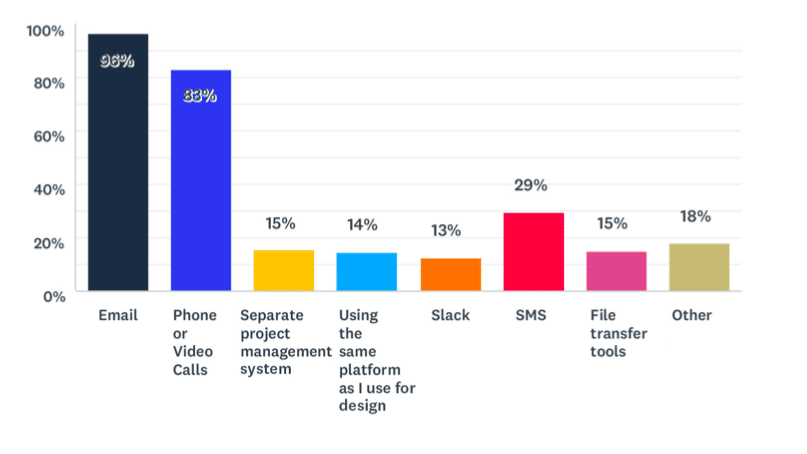 La ricerca suggerisce che la stragrande maggioranza delle comunicazioni con i clienti avviene tramite e-mail, utilizzata dal 96% dei web designer. L’83% lo integra con le telefonate o le videochiamate, mentre i numeri per SMS (29%), sistemi di gestione dei progetti (15%), strumenti di trasferimento file (15%) piattaforme di progettazione (14%) e Slack (13%) sono in ritardo .