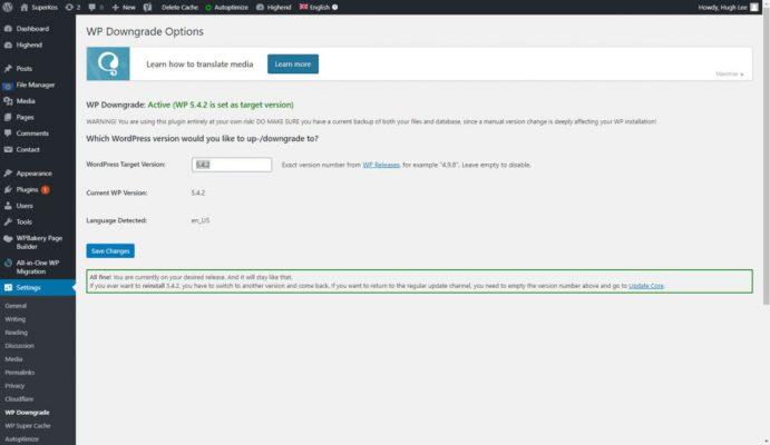 - Vai alle impostazioni del plugin (Impostazioni -> WP Downgrade) e inserisci la versione 5.4.2 e fai clic su Salva modifiche.